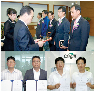 벌크 차량에 분무시스템 가동 등 차별화된 전사적 방역활동 펼쳐 ㈜카길애그리퓨리나 군산공장(공장장 유충식)과 정읍공장(공장장 최진호)이 전라북도(도지사 김완주)로부터 지난달 23일 FMD 발생 기간 중에 마지막까지 청정전북을 지키도록 방역에 일조한 공로를 인정받아 표창장을 받았다. 이번 표창은 카길애그리퓨리나 철저한 방역의식과 다양한 방역활동을 대표로 인정받아 의미가 있다. 군산공장과 정읍공장은 FMD가 발생하자마자 방역상황실을 운영하고, 회사 내 방역 최고단계를 공표하고 전사적 방역활동에 나섰다. 차단 방역을 우선으로 공장 내 일체의 차량과 사람을 통제하고, 회사 내 외부에 방역차량과 전담 인원을 배치하여, 철저한 방역을 위해 총력을 기울였다. 농장 방역을 위해 전 벌크 차량에 소독약 분무시스템을 설치하여 농장 반경 500m에 소독약을 살포하는 등 차단 방역에 올인했다. 특히 FMD가 도간 경계를 넘어설때 금강 하구둑 근처에 환적장을 설치하고, 공장 방역시스템 버금가는 방역설비를 설치여 차별화된 방역활동을 벌였다. 공장뿐 아니라 영업 현장에서는 방역활동 역시 탁월하여, 지역사회의 인정을 받고 있다. 지난 5월 퓨리나 연기 특약점 김규옥 사장은 매일같이 연기 지역 도로 및 축사 입구까지 소독하면서 FMD 방지에 힘쓴 공로를 인정받아 충남 연기군으로부터 표창을 받기도 했다. 카길애그리퓨리나는 방역활동 공로를 인정받은 것에 감사한다며 앞으로도 철저한 방역으로 우리 축산을 지키는데 앞장설 계획이다. |