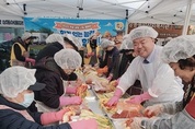 [축산신문 이일호 기자] 지난 11월 27일 한돈자조금관리위원회(이하 한돈자조금) 후원 김장나눔 행사가 열린 경기도 부천 상동종합복지관의 지하 1층 식당. 비가 오는 궂은 날씨 속에서도 도움이 필요한 이웃에게 전달할 김장(500kg) 담그기에 나섰던 50여명의 자원봉사자들 사이에서는 갓 삶아낸 한돈 수육의 깊은 맛에 탄성이 터져 나왔다. “그래, 이 맛이지”, “수육이 이렇게 맛있었나?”, “수육 때문이라도 김장을 해야 한다니까…” 이들의 수육 예찬은 한돈자조금이 후원한 국내산 돼지고기로 옮겨졌다. “수입(돼지고기)으로는 이런 맛이 안 나온다. 오직 국내산만 낼 수 있는 맛”이라는 반응과 함께 수입육에 대한 불만이 여기 저기서 이어졌다. 이번 김장캠페인에 참여했던 자원봉사자 숫자 만큼 한돈의 충성고객이 늘어나는 순간이었다. “수입 돼지고기 말고, 꼭 한돈 드셔야 한다”는 한돈자조금 이기홍 위원장(대한한돈협회장)의 당부에 자원봉사자들은 일초의 망설임도 없이 박수와 함께 “당연히 한돈”이라고 화답했다. 단순히 한돈자조금의 후원에 감사함을 표출하거나, 분위기에 휩싸인 반응만은 아니었다. 상당수 자원봉사자들은 “오늘 당장 한돈 사가야 겠다”며 저녁 메뉴로 화제를 돌