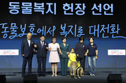 [축산신문 서동휘 기자] 농림축산식품부 송미령 장관이 지난 9월 26일 ‘제1회 동물보호의 날’을 맞아, ‘동물 보호에서 복지로의 대전환’을 주제로 부산 벡스코 제2전시장에서 기념행사를 개최했다. 이번 행사는 오는 10월 4일 법정 기념일인 제1회 동물보호의 날을 맞이해 국민적 공감대를 확산하기 위해 개최됐다. 이날 송미령 농식품부 장관, 김예지 국민의힘 의원, 성희엽 부산광역시 미래혁신부시장, 동물보호단체장, 유관기관장, 기업 등 300여 명이 참석, △동물복지 헌장 선언식 △농식품부와 봉사동물 기관 및 ㈜카카오와의 업무협약 체결 △동물복지유공자 시상 등이 진행됐다. 송미령 장관은 “10월 4일이 법정 기념일인 동물보호의 날로 지정된 것은 우리나라도 동물복지 선진국으로 나아가는 큰 걸음을 내디뎠음을 의미한다”며 “정부도 ‘사람과 동물이 더불어 행복한 사회를 국정과제로 선정해 동물복지를 국가의 핵심 정책으로 이끌어나가고자 한다”고 했다. 축산신문, CHUKSANNEWS
