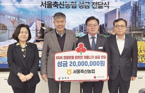 [축산신문 김길호 기자] 서울축협(진경만 조합장)은 구랍 29일 조합 본점이 위치한 강서구청을 방문해 ‘희망온돌 따뜻한 겨울나기’ 사업<사진>을 위한 성금 2천만원을 기탁했다. 이번 성금은 서울사회복지공동모금회와 서울시, 25개 자치구가 함께 추진하는 ‘희망온돌 따뜻한 겨울나기’ 모금 캠페인의 일환으로, 강서구 관내 저소득 취약계층을 위한 긴급 생계·난방 지원 등 겨울철 복지 지원에 사용될 예정이다. 진경만 조합장은 “지역에서 받은 신뢰와 성원을 다시 지역사회에 돌려드리는 것이 협동조합의 본분이라고 생각한다”며 “이번 성금이 강서구의 어려운 이웃들에게 따뜻한 위로가 되기를 바란다”고 말했다. 이어“서울축협은 앞으로도 지역과 함께 숨 쉬며, 나눔과 상생을 지속적으로 실천하는 협동조합이 되도록 노력하겠다”고 밝혔다. 축산신문, CHUKSANNEWS