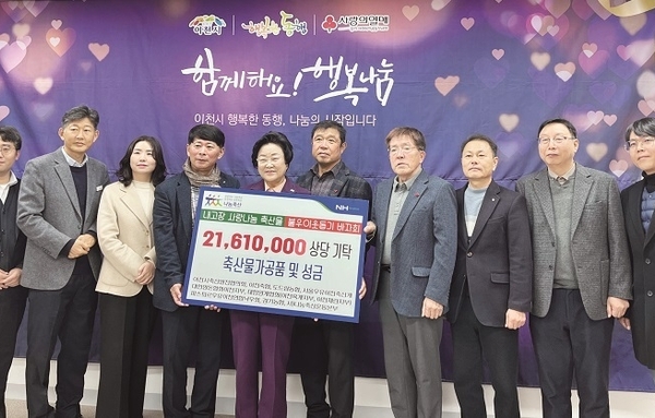 [축산신문 김길호 기자] 경기 이천축협(조합장 임영묵)은 구랍 29일 경기농협(본부장 엄범식)과 나눔축산운동본부 경기도지부(지부장 이덕우·남양주축협장)와 함께 이천시청에서 지역 소외계층을 위하여 2천100만원 상당의 ‘바자회 수익금 기탁 및 축산물 전달식’<사진>을 개최했다. 이날 행사는 연말을 맞아 축산업의 공익적 가치를 실천하기 위해 마련됐으며, 김경희 이천시장, 임영묵 이천축협 조합장, 이천시축산발전협의회 회원 등 지역 관계자들이 참석해 나눔의 의미를 더했다. 이천시에 전달된 수익금과 축산물은 관내 취약계층과 복지시설에 지원될 예정이다. 임영묵 조합장은 “이천축협은 지역사회와 함께 나눔을 실천하며 지역사회발전을 위해 노력하고 있다. 이번 나눔이 연말연시 소외계층에 전달되어 따뜻한 겨울나기가 되길 바란다”고 말했다. 축산신문, CHUKSANNEWS