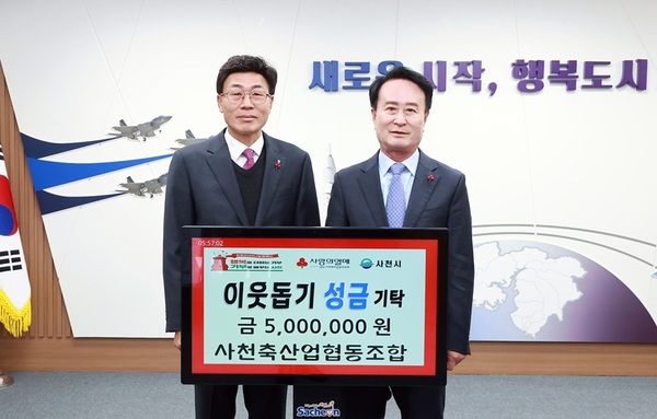 [축산신문 권재만 기자] 경남 사천축협(조합장 이형주)은 지난 7일, 사천시청을 방문해 지역 내 어려운 이웃을 돕기 위한 불우이웃돕기 성금 500만 원을 기탁<사진>했다. 이번 성금은 지역사회 나눔 실천의 일환으로 마련됐으며, 임직원들이 12월 급여의 일정 금액을 모아 마련한 성금 200만 원과 조합 출연금 300만 원을 더해 조성됐다. 기탁한 성금은 사천시와 경남사회복지공동모금회가 협약해 추진하는 ‘희망나눔 4000 이웃사랑’ 지원사업 기금으로 조성되어 관내 저소득층과 취약계층 등 도움이 필요한 이웃들에게 사용될 예정이다. 이형주 조합장은 “지역과 함께 성장해 온 협동조합으로서 어려운 이웃과 온정을 나누는 것은 당연한 책무”라며 “앞으로도 지역사회와 상생하는 다양한 나눔 활동을 지속해 나가겠다”고 밝혔다. 한편, 사천축협은 매년 불우이웃돕기 성금 기탁을 비롯해 지역사회 공헌 활동을 꾸준히 이어가며, 협동조합의 공익적 역할을 충실히 수행하고 있다. 축산신문, CHUKSANNEWS