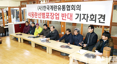 한국계란유통협회(회장 강종성) 비상대책위원회(위원장 최홍근)가 지난 15일 서울 용산 소재 한 식당에서 ‘식용란선별포장업 신설 반대’ 기자회견<사진>을 개최했다.
