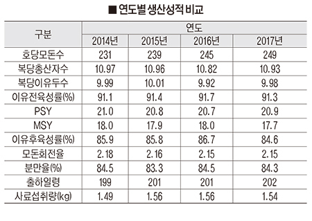 특히 2016·2017년 생산성 상하위 농가를 비교한 결과 PSY가 7두의 차이를 보인데 비해 MSY는 10두까지 벌어진 사실에 주목했다.