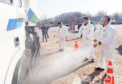 지난 6일에는 조소행 농협충남지역본부장이 조두식 천안시 지부장과 함께 현장을 방문해서 정문영 천안축협조합장으로부터 초소 운영상황을 설명 받고 소독 시연<사진>을 실시한 바 있다.