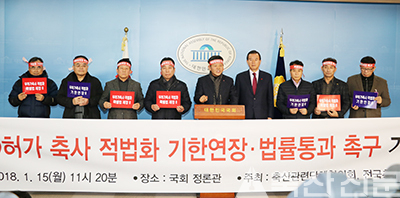 축산관련단체협의회(회장 문정진)와 전국축협조합장협의회(회장 정문영), 자유한국당 의원들은 지난 15일 국회 정론관에서 무허가축사 적법화 기한 연장과 특별법 제정을 촉구하는 긴급 기자회견<사진>을 열고 ‘무허가축사 적법화 기한 연장’과 관련 ‘특별법 제정’을 촉구했다.