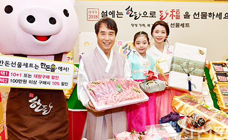 한돈자조금관리위원회(이하 한돈자조금)는 지난 24일 서울 세종문화회관 예인홀에서 ‘한돈 설 선물세트 포토행사’를 가졌다. 지난 2010년부터 명절에 한돈선물세트 보내기 캠페인을 전개해 온 한돈자조금은 올해 설에는 ‘돈福 가득 한돈 선물세트’를 슬로건으로 가심비(價心比)를 추구하는 소비트렌드를 겨냥한 상품으로 소비자들에게 다가가고 있다. 이날 행사에는 한돈자조금 하태식 위원장과 17년 한돈 홍보모델 헬로 비너스 나라가 다양한 한돈선물세트를 선보이고 있다.