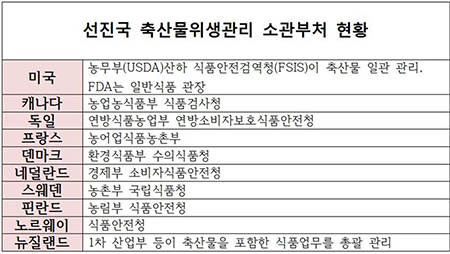 박근혜 정부 때 식품의약품안전처로 이관된 축산물 위생·안전 업무를 농림축산식품부로 되돌려 축산물 생산·유통·소비·안전 관리를 체계화해야 한다는 목소리가 국회에서 나오고 있다.
