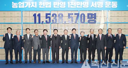 이날 추진연대는 국회 개헌·정개특위 김재경 위원장과 농림축산식품해양수산위 설훈 위원장에게 농업가치 헌법반영 서명운동에 참여한 1천만 명의 서명지를 전달했다. 대회에서는 각계 참석자 대표들의 국민 공감 운동 확산 세레머니도 있었다. 서명운동에는 총 1천153만8천570명(12월8일 기준)이 참여했다.