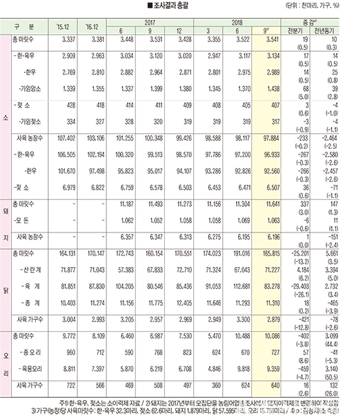 통계청은 지난 18일 2018년 3/4분기(9월1일 기준) 가축동향조사 결과를 발표했다. 가축 사육마릿수는 어떻게 변화했을까. 통계청은 전년 동기 대비 한ㆍ육우, 돼지, 산란계, 육계, 오리는 증가한 반면 젖소는 감소했다고 밝혔다. 산업별 사육동향을 정리해보았다./ 표 참고