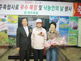 첨단과학낙농의 꿈이 우리 곁에서 현실이 되어 펼쳐지고 있다. 한발 앞서 ‘미래낙농’을 실천하고 있는 곳은 바로 경기도 양주시 은현면 운암2리에 있는 산내음목장(대표 신동현)이다. 양주축협(조합장 윤기섭)은 지난 3일 산내음목장에서 ‘우수목장 및 낙농인의 날’ 행사를 가졌다. 이날 행사에는 양주지역은 물론 평택, 홍성, 부산 등지에서 400여명의 시도공무원과 낙농인들이 참석해 높은 관심을 보였다. 이날 행사가 주목받은 이유는 산내음목장이 지난 3월 로봇착유기를 설치, 양주축협에서 개발한 로봇착유기에 적합한 ‘TMR사료 급여체계’를 통해 우수목장으로 거듭났기 때문이다. 양주축협 배합사료공장은 이날 산내음목장 현황에 대해 평균 착유두수 31두, 두당 평균유량 39.67㎏을 착유하면서 유지방은 3.8%에 체세포 16만을 유지하고 있다고 소개하면서 우수목장에 선정된 배경을 밝혔다. 양주축협은 일일 두당 평균사료비용은 1만674원이며, 우유 1㎏당 생산에 들어가는 사료비용은 236원이라고 설명했다. 신동현 대표는 “혈통 좋은 소를 사육하면서 전체 유량은 지속적으로 증가하고 있다”며 “착유시간을 철저하게 지키고, 항상 직접 착유하면서 양주축협 사료를 고집한 것이 좋은 성적을 나타낸 것 같다”고 우수목장 수상소감을 밝혔다. 신 대표는 특히 “개체별 관리는 물론 혈통관리를 철저히 하고 기록하면서 좋은 결과를 얻었다”며 “유량은 사료관리만으로 가능하지만 경제수명이나 질병문제는 기록관리가 가장 중요하다”고 강조했다. 신 대표는 또 “로봇착유기 설치를 통해 낙농업이 지속가능한 산업이라는 청사진을 제시했다는 점에서 자부심을 갖는다”고 말했다. 이날 열린 동조물산(대표 이용구)의 ‘랠리(LELY) 로봇착유기’시연회는 참석자들의 높은 관심을 모았다. 한편, 양주축협은 이날 전국 생애 최고산유량을 기록하고 있는 연산목장(대표 김삼용진)의 수퍼 젖소 ‘힘순이’의 성적에 대해 소개했으며, 농협젖소개량부 2006년도 검정농가 3천680명 중 상위 20위 이내 조합원 5명에게 꽃다발과 농산물 상품권을 전달하고 격려했다. |