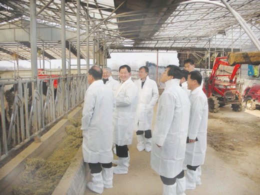 지난 6일 국립수의과학검역원 강문일 원장(왼쪽서 두번째)을 비롯 화성시 이철행 부시장, 경기도 가축위생연구소 이성식 소장 등은 낙농가들과 함께 화성시 소재 진주목장(대표 박응규)을 방문하고 방역문제에 대한 질의 응답시간을 가졌다. 이날 즉석에서 이뤄진 간담회에서 강문일 원장은 낙농가들이 현장에서 겪는 애로사항에 대해 청취하고 이에 대한 대응방안을 강구하겠다고 화답했다.