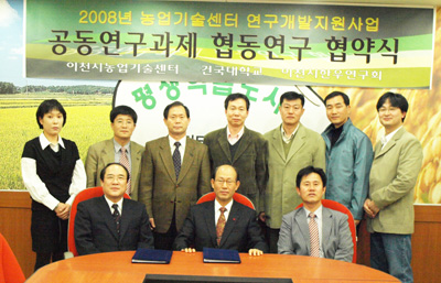 지난 12일 이천농업기술센터에서는 ‘한우사육의 생산비 절감과 생산성 향상을 위한 공동연구과제 협약식’<사진>이 있었다. 이날 협약식에는 이천농업기술센터 유용식소장과 건국대 전병태교수, 이천한우회 임관빈 회장 등 관계자들이 참석했다. 특히 이번 연구과제 ‘천연소재를 이용한 한우사육의 생산비 절감과 생산성 향상에 관한 연구“로 2008년부터 3년간 2억9천만원의 비용을 투입해 이천농업기술센터, 건국대학교, 이천한우회가 공동으로 추진하게 된다. 전병태 교수는 “유가와 곡물가 상승으로 수입원료에 의존한 축산업 발전은 더 이상 기대하기 어렵게 됐다” 며 “한우산업의 메카 이천에서 시의적절하게 시작하는 의미있는 연구에 동참하게 돼 기쁘게 생각한다”고 말했다. 유용식 소장은 “지역 농가 경쟁력 향상에 큰 도움을 줄 수 있도록 좋은 연구가 되길 바란다”고 밝혔다. 이번 연구는 세부적으로 ▲봉독과 미생물을 활용한 송아지 육성율 향상과 번식효율향상에 관한 연구 ▲두부박섬유질배합사료 사양으로 생산비 절감과 고급육 생산에 관한 연구 ▲천연소재를 이용한 기능맞춤형 한우용 완전배합사료 개발에 관한 연구 등 총 3가지 세부과제로 추진된다. 이천농업기술센터 오백영 경영축산팀장은 “이번 연구는 큰 목표를 한우경쟁력 강화에 맞추고 이를 위한 세부항목으로 봉독, 미생물, 부산물 등을 생산현장에서 저비용, 안전축산물 생산 방안을 모색하는 연구가 될 것”이라고 설명했다. |