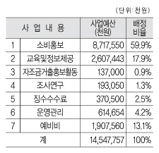 농림수산식품부는 최근 2008년도 양돈자조금사업예산(안)을 일부 조정, 최증 승인함에 따라 올 양돈자조금 사업이 본격적으로 전개될 전망이다. 올해 양돈자조금사업 규모는 대한양돈협회와 농협 등 주관단체가 요구한 1백37억1천만원 보다 8억3천8백만원이 늘어난 것으로 이월 이익 잉여금이 당초 전망치 보다 증가한데 따른 것이다. 특히 소비홍보사업 가운데 TV광고의 경우 55억3천만원의 예산이 배정, 올해에도 양돈자조금사업 가운데 가장 높은 비중을 차지했다. 여기에 오는 29일 돼지고기 소비촉진을 위한 ‘포크페스티벌’에 3억5천만원을 새로이 투입한다는 방침인 반면 국산돼지고기판매인증점 예산이 일부 삭감돼 소비홍보사업은 당초 주관단체 요구액 보다 3억3천1백만원이 증가했다. |