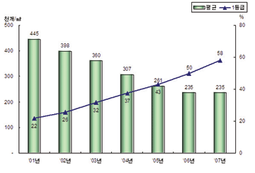 원유 유질이 해마다 향상, 체세포 1등급 비율이 60%에 육박하고 있다. 낙농진흥회에 따르면 지난해 체세포 20만 미만(개/㎖) 1등급 비율이 58.1%로 높아졌을 뿐만 아니라 전체 원유의 평균 체세포수도 23만 5천개로 선진국 수준에 올라선 것으로 나타났다. 국내 원유의 체세포 1등급 비율은 지난 2001년만해도 21.7% 수준에 머물렀다. 그러나 이후 2003년에는 30%를 넘었으며, 2005년에는 40%를, 2006년에는 50%를 넘어 가파른 상승세를 이어오고 있다. 이같이 유질이 급상승 한 것은 소비자들이 위생적이고 안전한 우유를 요구하고 있는데다 원유가격 체계 또한 유질을 적극 반영한 때문으로 풀이되고 있다. 특히 2004년 원유 가격인상시 체세포수 5등급(75만/㎖ 초과) 농가에 대해 규제를 대폭 강화하고 잉여원유차등가격제 등 유질개선을 위한 특단의 조치가 내려짐으로써 유질 급상승을 불러온 것으로 분석되고 있다. 업계 관계자는 “최근 2~3년 동안 소비자 신뢰가 가장 중요한 자산이라는 인식이 농가들 사이에 확산됨에 따라 유질 향상에 더욱 나섰다”며 “젖소농장에 대한 HACCP 도입등 제도적 접근도 유질 향상에 한 몫 했다고 평가했다. 한편 지난 해 평균 세균수는 1㎖당 3만 미만의 1등급이 96.3%로 향상돼 안정세를 유지하고 있다. |