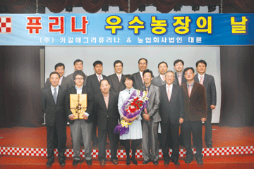 ‘4원’계획 철저 실천 PSY 30두·MSY 28두 자신 “생산성 향상만이 고곡가 극복” 희망 메시지 전해 “도전! PSY 30두, MSY 28두.” 이는 대륜농장(사장 이현주)이 도전할 목표치로 여느 농장에서는 꿈의 수치이다. 그러나 대륜농장에서는 카길애그리퓨리나가 제시하는 원칙을 지키고, 기본대로 하며, 미리미리 준비하면서 때를 기다리면 이 목표치는 무난히 달성할 수 있을 것임을 확신하고 있다. 대륜농장 이현주 사장의 이런 확신은 지난 11일 카길애그리퓨리나(사장 정학상) 21지구(영업이사 박용순) 주최로 열린 퓨리나 사료 우수농장인 대륜농장에 대한 소개회의<사진>에서 확인됐다. 대륜농장의 성공은 이현주 사장의 철학인 원칙과 퓨리나 4원계획에 의한 우수한 가축, 합리적 관리, 철저한 방역, 완전한 영양이 만들어낸 합작으로 평가되고 있다. 이날 소개회의에서 박용순 퓨리나 21지구 영업이사는 “국내 양돈업은 현재 고비용, 저생산성, 저돈가로 어려움에 처해 있지만 어려움을 극복할 수 있는 방안은 생산성 향상”임을 강조하고, “대륜농장의 성공적인 모델을 통해 생산성 향상에 대한 희망을 함께 공유하자”고 말했다. 박필규 부장은 ‘내일을 준비하는 양돈경영’이라는 주제발표에서 현재 양돈산업은 구조조정 중이지만 곡물가격 상승 후 반드시 돈가가 상승할 것으로 내다보면서 호황이 곧 올 증거로 모돈감소, 자돈 사료량 감소 등을 꼽고, 생산성 향상의 중요성을 강조했다. 박 부장은 내일을 준비하는 양돈 경영전략으로 ▲번식돈에 투자하자(철저한 후보돈 도입계획과 격리후보돈사 운영으로 모돈을 건강하게 하자 ▲태어난 자돈은 다살리자(분만보조 실시와 잘 먹이자) ▲사람에 투자하자(농장으로 들어가 한번 더 보고, 기록, 직원교육을 강화하자) 등 3가지를 제시했다. |