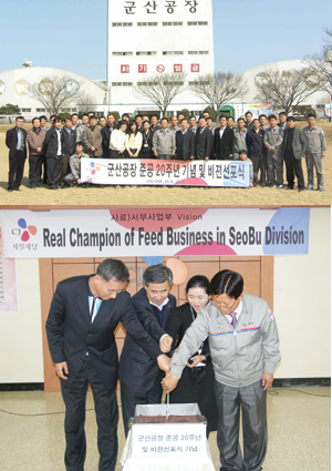 CJ제일제당 사료BU(대표이사 김진수) 서부사업부가 지난달 20일 비전 선포식<사진>을 갖고, 힘찬 도약을 다졌다. 이번 행사는 서부사업부의 군산공장 준공 20주년을 기념하고 새로운 비전 선포를 통한 구성원들의 단결과 힘찬 도약을 결의하기 위해 마련된 것. 이날 김성호 서부사업부장은 ‘Real Champion of Feed Business in SeoBu Division’이라는 비전을 제시하고, 이 비전을 수행하기 위한 4대 세부 미션을 발표했다. 이날 발표한 4대 미션은 ▲매출/수익 극대화 위한 최강의 영업조직 전문화 ▲고객니즈 만족을 위한 ID Feed Biz 확대 (Individaul Design Feed Business) ▲지속적 성과 창출로 Cost 경쟁력 확보 ▲ 핵심 역량 강화로 최고의 기술력 확보이다. 이번 비전과 미션은 궁극적으로 고객에게 수익과 니즈만족, 서비스를 제공하기 위해 디자인 됐으며, 대대적인 조직재편과 경쟁력 있는 공장으로 변화모색을 통해 ‘고객을 위한 초일류 사료회사’가 되고자 하는 CJ Feed의 의지가 담겨져 있다. 이날 참석한 CJ 관계자는 “비전 선포식을 통해 최근 어려운 축산환경을 정면 돌파 할 수 있는 자신감과 강력한 공감대가 형성되었다”며 “앞으로도 CJ Feed가 국내 토종사료 국가대표로서의 위상을 높일 수 있도록 최선을 다하겠다”고 밝혔다. |