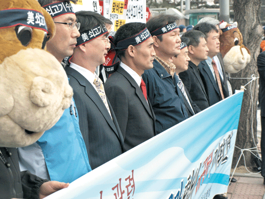 ‘한미 쇠고기 위생검역 대표자회의 규탄 기자회견’에서 농민단체장들이 침통한 표정으로 행사에 임하고 있다. 사진 왼쪽부터 우영기 서울경기지역한우유통감시단장, 정선현 대한양돈협회전무, 조위필 한우협회충북도지회장, 남호경 한우협회장, 박의규 한농연회장.