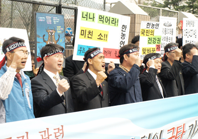 이날 기자회견에는 한우협회 남호경회장과 조위필 충북도지회장, 양돈협회 정선현전무, 한농연 박의규 회장 등이 참석했다. 18대 총선 직후 바로 진행된 미산 쇠고기 검역논의 소식에 참석자들은 다른 어느 때 보다 침통한 표정으로 기자회견에 임했다. 또한, 이 부분에 대해서도 국민여론을 피한 비겁한 행위라고 비난했다. 남호경 한우협회장은 “수십 차례 검역조건을 위반한 미국의 요구에 끌려가는 협상은 더 이상 협상이라 말할 수도 없다”며 “새 정부에 희망을 걸었던 농민들을 배신한 행위는 틀림없이 국민의 심판을 받게 될 것”이라고 말했다. 박의규 한농연회장은 이번 대표자 회의에 대해 “이명박 대통령의 미국방문을 앞두고 선물을 만들기 위한 회의임에 틀림없다”며 “미국 내 안전시스템 구축과 충분한 국민여론 수렴이 선행된 다음 협상을 진행해 신뢰받는 정부로 거듭나길 바란다”고 밝혔다. 이날 발표한 기자회견문에서는 기술적인 안전성문제를 정치적으로 해결하려는 미국의 태도에 대한 지적과 함께 사료가격 상승, 가축전염병 발생 등에 대한 대책 마련은 뒤로 미뤄두고 무조건 쇠고기 수입을 추진하는 정부의 태도에 안타까움을 드러냈다. 또한, 미산 쇠고기는 지난 2월 사상최대 리콜사태가 발생했고, 최근에는 인간광우병 의심환자까지 발생한 상황인 만큼 안전성에 대해 절대 신뢰할 수 없는 수준임을 강조했다. 한편, 이날 참석자들은 국민의 안전성문제를 정치적으로 해결하려는 모습으로 비춰지는 현 상황을 풀기 위해서는 국민이 신뢰할 수 있는 협상 결과를 내놓아야 할 것이며, 수입재개로 인한 축산농가의 피해를 최소화할 수 있는 보호대책 우선 마련을 촉구했다. |