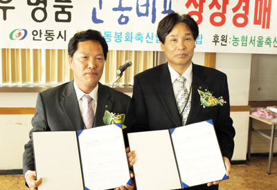 안동봉화축협(조합장 전형숙)은 지난달 25일 농협서울축산물공판장에서 ‘안동비프’브랜드 상장경매를 협약식을 갖고 본격적인 한우고급육 시장 진출을 선언했다. 이날 전형숙 조합장은 “안동은 예로부터 한우 주산지로서 그 향이 깊고 풍부한 것이 특징” 이라며 “다른 어느 지역에서도 따라올 수 없는 안동한우의 참맛에 틀림없이 좋은 평가를 받게 될 것”이라고 자신했다. 아울러 “전반적인 여건이 어렵고 힘들지만 농가 모두 우리 것 한우를 지킨다는 자부심으로 최선을 다해 주시길 부탁드린다”고 말했다. 윤정길 안동부시장은 “오늘은 안동명품한우가 재도약하는 뜻 깊은 날” 이라며 “오늘을 계기로 더욱 발전하는 모습을 기대하며, 안동시는 지원을 아끼지 않을 것”이라고 밝혔다. 안동비프는 지난해 11월부터 시범상장을 시작해 61마리를 출하했다. 예비상장 결과는 1등급이상이 86.9%, 육량 A,B등급은 83.6%로 육질육량 모두 전국평균치를 웃돌았다. 이날 출하한 16마리는 상장경매 결과 최고가 19,480원/kg이 나왔다. 안동비프는 매주 금요일 상장경매를 실시한다. |