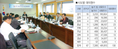 제1기 낙농자조금 대의원 임기 만료가 다가옴에 따라 2기 대의원 선거가 오는 2010년 1월 21일 치러진다. 낙농자조금관리위원회(위원장 이승호)는 지난 10일 제2축산회관 회의실에서 제 4차 관리위원회<사진>를 개최하고 이 같이 결정했다. 이와 함께 개정된 자조금법에 따라 130명의 대의원도 농가수 및 사육두수 비율에 따라 67개 선거구별 대의원수 배분도 확정했다. 시도별 대의원수 배분 현황을 보면 경기도가 가장 많은 16개 선거구에서 55명의 대의원이 배정 받았으며 다음으로는 충남이 11개 선거구에서 23명의 대의원이 배정됐다. 이어 경북과 경남이 각 9개 선거구로 대의원 수는 각각 13명과 9명이며 전북과 전남에서는 각각 9명의 대의원이 배정됐다. 이 밖에도 충북은 6명, 강원은 5명, 제주에서는 1명의 대의원을 뽑게 된다. 향후 선거 일정을 살펴보면 오는 12월 17일 선거인 명부를 확정하고 12월 22일까지 선거인명부를 비치, 선거 공고에 들어갈 예정이다. 이어 내년 1월 1일까지 대의원 후보자 등록를 받아 1월 21일 대의원 선거를 치르기로 했다. 이에 앞서 대의원 선거를 위해 실시된 전국 낙농가 실태조사에서는 총 7천393농가인 것으로 나타났으며 사육두수는 48만1천813두 였다. |