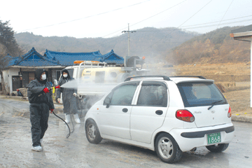 생석회는 알카리성이므로 산성소독제 뿌리지 말아야 겨울철에는 병원체의 야외생존성이 길어지므로 더욱 철저한 소독이 요구된다. 분사된 소독수가 얼어붙어 효과가 즉시 나타나지 않을 수 있으나 녹을 때 소독효과를 발휘된다. 소독수가 얼지 않도록 호스, 파이프, 노즐 등 소독기구에 남아있는 소독수를 제거한 뒤 보온덮개를 한다. 미지근한 물에 소독약을 희석하고, 일단 희석한 소독제는 전부 사용한다. 소독제의 동결방지는 열선 등 보온장치가 바람직하다. 인체독성이나 환경독성이 없는 동결방지제는 아직 개발돼 있지 않다. 장시간 소독 또는 소독제에 과다노출될 경우, 피부, 점막 등을 자극할 수 있다. 보호장구 착용, 물로 충분히 씻어냄 등 안전수칙을 준수하고, 권장희석배율을 지킨다. 일반차량은 차량바퀴와 외부를 소독하고, 축산관련차량은 안과 밖 전체를 소독한다. 기온이 영하로 떨어지면, 차유리 소독은 금한다. 바닥에는 부직포를 충분히 깔고, 소독 후에는 염화칼슘을 살포해 결빙을 방지한다. 산성제제와 염기제제를 같이 사용하면, 중화돼 소독효과가 없어질 수 있다. 염기제제는 차량 페인트를 벗겨지게 할 우려가 있고, 알루미늄 계통에는 사용을 피해야 한다. 구제역 바이러스는 pH 6 이하, pH 9 이상에서 사멸한다. 생석회는 과립형을 사용한다. 소량의 물을 골고루 뿌리고, 생석회를 충분히 살포한다. 물과 결합해 열반응(200℃ 정도)이 나타나고, 병원체를 사멸한다. 열반응 후에는 소석회로 변해 강알카리(pH 11~12) 작용을 한다. 차량바퀴가 1회전 할 정도로 살포한다. 차량의 서행을 유도해 생석회가 부착되도록 한다. 생석회는 알카리성이므로, 생석회 위에 산성 소독제를 뿌리지 않도록 한다. 생석히 사용시 사람과 가축에 직접 접촉되지 않도록 주의해야 한다. 눈에 들어갔다면, 손으로 비비지 말고, 흐르는 물 또는 식염수로 눈을 씻은 후 병원에 가야 한다. 특히 보관시 수분과 접촉할 경우 200℃ 이상의 발열이 일어나 화재위험성이 있다. <자료제공:국립수의과학검역원> |
