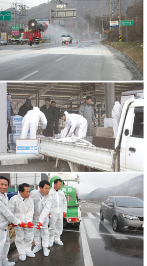 양평축협(조합장 윤철수)은 명품브랜드 ‘물맑은양평개군한우’ 사수에 총력을 기울이고 있다. 양평군과 양평축협은 인접한 가평군을 비롯해 강원지역에서 구제역이 발생됨에 따라 김선교 군수 주재로 실과소장 및 읍면장 모두 참여하는 구제역 대응 긴급회의를 열어 구체적인 대응방안을 논의하고 청사에 24시간 특별방역대책상황실을 가동하고 있다. 기존 3곳의 이동통제소를 6개소로 확대하고 공무원, 경찰, 소방서, 민간방범기동순찰대, 해병전우회, 민간단체 등과 공조해 강도 높은 대응에 나서고 있다. 구제역 확산을 막기 위해 각종 행사는 물론 5일장까지 모두 취소하거나, 구제역 해제 시까지 무기한 연기했다. 또한 윤철수 양평축협 조합장은 “경기도를 대표하는 물맑은양평개군한우 브랜드를 지키기 위해 24시간 방역체제를 갖추고 전 직원이 구제역 유입방지에 최선을 다하고 있다”고 말했다. 휴일도 잊고 비상방역체제 가동 김천축협(조합장 임영식)은 축산계장, 한우협회, 양돈협회, 양계협회, 육계협회, 염소협회 등 축종별 회장단이 모여 구제역 방역협의회를 구성하고 임영식 조합장을 상황실장으로 비상상황실을 운영하고 있다. 김천축협은 구제역이 종식되는 순간까지 예찰활동과 문자메시지 발송, 방역 상황실을 매일 점검하는 등 주말을 포함해 매일 축협 본점에서 방역협의회를 개최하여 방역활동을 점검하고 있다. 김천축협은 본점창고와 가축시장 사료창고에 전담직원을 배치하고 소규모 양축농가의 소독약품 배부<사진>와 함께 매일 3~4개 면과 집단사육지역에 축협 방역차량을 동원해 소독활동을 전개하고 있다. 생석회 2천500포, 방역복 2천500개, 장갑 2천500개, 발판소독조 25개, 위생장화 2천500개 등 방역물품 공급도 완료했다. 방역장비 풀가동…취약농가 소독 농협전남지역본부(본부장 김용복)는 구제역의 유입방지를 위해 차단방역활동에 총력을 다하고 있다. 전남농협은 구제역비상방역상황실을 시군지부 및 지역 농축협까지 확대하고 전남도와 협조하여 시군 공동방제단에 적극 참여함은 물론 축산농가에서 자율적으로 농장소독 및 사람에 대한 출입을 통제하도록 홍보하고 있다. 또한 축협 보유 방역장비를 이용하여 취약지 및 농가소독을 실시하고 있다. 전남농협 김용복 본부장은 지난 21일 화순군 앵남삼거리 방역초소 현장을 방문해 근무자를 격려하고 구제역 등 악성가축질병 근절만이 축산업 기반을 지켜나갈 수 있다는 점을 강조하면서 방역당국, 축산농가, 농협 임직원이 혼연일체가 되어 차단방역에 최선을 다해줄 것을 당부했다. |