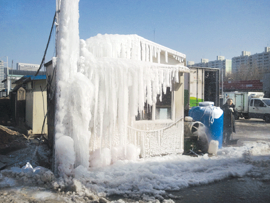 전국이 구제역으로 비상 상황이다. 특히, 전국에서 소, 돼지가 출하되는 농협서울축산물공판장의 경우 방역에 더욱 민감할 수 밖에 없다. 공판장은 소가 들어오고 나가는 길목에 방역기를 설치하고 24시간 풀가동하고 있다. 사진은 방역기 가동으로 인해 공판장 경비초소가 고드름으로 뒤덮힌 모습이다.