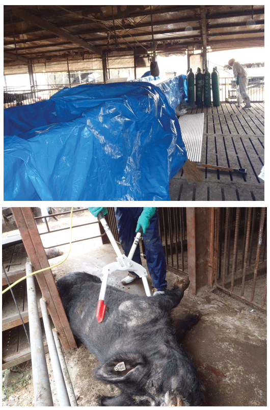 어느정도 공기 차단되면 가스 질식 가능…대량매몰 적합 마취제 대신 소독약 주입…전살기 큰 개체 처분 효과적 마취제 공급부족으로 매몰처분작업이 차질을 빚고 있을 뿐 만 아니라 그나마 주사가 어렵고 효과도 크게 떨어지는 돼지의 경우 생체 매몰에 따른 논란이 끊이지 않고 있기 때문이다. 수의전문가들은 일본 미야자키현 구제역 당시 CO2가스와 전살기까지 동원했던 사례에 주목하고 있다. 일본에서는 돼지 매몰처분시 CO2가스를 활용하면서 주사제의 비효율성과 함께 수의전문 인력난까지 어느 정도 해소된 것으로 전해졌다. 돈사통로에 비닐을 깔고 돼지를 몰아넣은 뒤 비닐로 덮어 가스를 주입하거나 아예 돈방위에 비닐을 덮어 가스를 주입한 뒤 끌어내는 방법이 그것이다. 이는 마취제 주사와는 달리 굳이 수의사가 아니더라도 매몰작업이 가능할 뿐 만 아니라 한꺼번에 많은 개체수를 매몰해야 하는 양돈장에 적합한 것으로 분석되고 있다. 휴대용 발전기를 활용한 전살기와 마취제 대신 소독약을 주입하는 방법도 개체가 큰 소의 매몰처분에 효과적이라는 것이다. 얼마전 내한한 일본의 한 수의전문가는 “가스주입 방식의 경우 반드시 밀폐가 이뤄져야 할 필요는 없다”며 “어느 정도 공기를 차단한 뒤 상황에 따라 가스주입량 조절만으로 질식이 가능하다”고 설명하기도 했다. 그는 이어 “일본 역시 소에 대해서는 마취제 주사를 주로 사용했다”며 “하지만 주사약이 부족해지자 전문가들의 의견을 토대로 소독약을 정맥주사하거나 전살기를 동원했지만 별다른 문제점은 없었던 것으로 안다”고 전했다. 한국축산컨설팅협회 정현규 회장은 최근 구제역이 빠른 속도로 확산되고 있는데다 과거와 같은 군대동원이 어려워지면서 매몰처분작업이 큰 차질을 빚고 있는 것이 현실에 주목하면서 “신속하고 정확한 매몰처분이 구제역 확산 방지를 위해 무엇보다 중요한 만큼 보다 효율적인 매몰처분 방법이 무엇인지 다각적인 검토가 시급하다”고 강조했다. |
