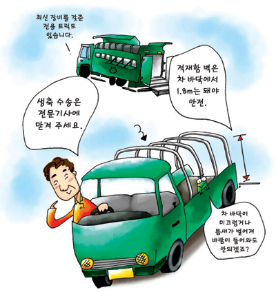 수송차량은 최소한 몇 가지 조건을 기본적으로 갖춰야 한다. 우선 적재함 바닥이나 벽은 적당한 높이를 유지해야 한다. 이 때 적재함 벽은 바닥에서 1.8m가 적당하다. 바닥은 미끄럽지 않고 틈새가 잘 막혀 있으며 청소와 소독이 용이해야 한다.