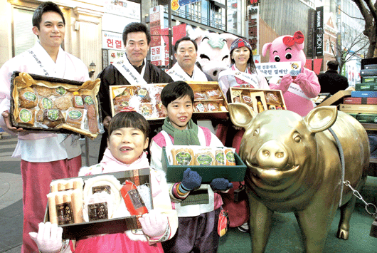 양돈자조금관리위원회와 대한양돈협회는 지난 19일 서울 명동에서 한돈햄 시식회를 가졌다. ‘2011년 설날 한돈 햄 선물세트 소비촉진 전국민 캠페인’의 일환으로 실시된 이번 행사에는 양돈협회 이병모 회장이 돼지고기 홍보대사인 탤런트 이한위씨 등과 함께 한돈 수제 햄으로 만든 6,000인분의 요리를 시민들에게 나눠주며 한돈 햄에 대한 관심과 애정을 당부했다.