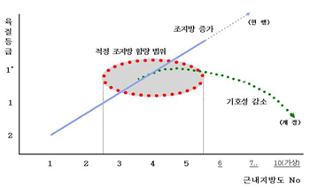 우리나라 ’09년도 돼지고기 평균 근내지방도는 약 2.1에 불과하다. 현행 1+등급의 근내지방도는 No.4~5, 1등급 No.2~3, 2등급 No.1의 체계로 되어 있으며, 개정방향도 같은 체계로 갈 것이다. 이는 아직도 근내지방도를 높이기 위한 노력에도 불구하고 효과를 단기간에 볼 수 없기 때문으로 아래 그림의 적정 조지방 함량 범위인 3~5% 수준까지 향상시키기에는 시간과 많은 노력이 필요할 것이다. |