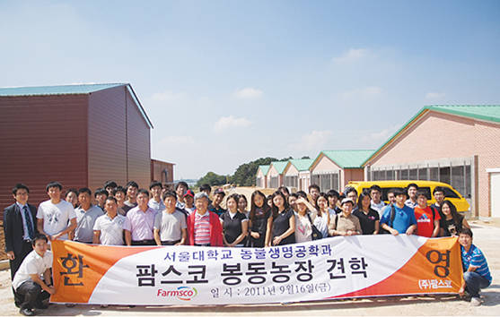 학생들과 함께 종부사, 임신돈사, 배기 시설 등을 둘러본 김유용 교수는 “팜스코의 봉동농장이 한국 양돈산업의 새로운 전기를 마련할 것”이라며, 학생들에게 “축산을 전공하는 서울대 학생들이 졸업 전에 진로를 깊게 고민하는 계기로 삼길” 당부했다.
