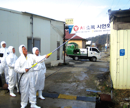 “AI 발생 원천 차단해 한국축산 지킨다.” 농협축산경제(대표 남성우)와 대전충남양계농협(조합장 이현수)은 지난달 27일 충남 천안시 풍세면 용정리 양계단지 내 청운농장(대표 황영도)에서 ‘AI소독시연회’를 개최했다. 시연회에는 정문영 천안축협장, 김용태 금산축협장, 김우영 부여축협장, 이제만 대충양돈축협장 등 충남축협 조합장들과 방역요원 등 축산관계자들이 참석했다. 남성우 대표가 계사 외벽에 소독약을 살포하고 있다. 남 대표 뒤쪽으로 방역복을 입은 정문영 조합장과 이현수 조합장이 소독장면을 지켜보고 있다.