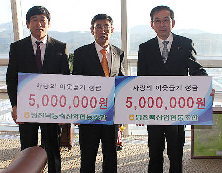 당진낙협과 당진축협 임직원들은 지난 연말 불우이웃돕기 성금으로 500만원을 모았다. 이경용 조합장과 차선수 조합장은 구랍 26일 당진시청을 직접 방문해 이철환 시장에게 성금을 전달<사진>하고 지역사회의 소외계층을 위해 사용해 달라고 당부했다.