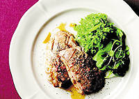 6. 윤기가 나도록 노릇하게 익힌 오리 스테이크를 접시에 담고 2를 곁들인다.