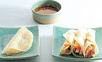 2. 밀전병 반죽을 분량대로 섞어서 망에 한 번 걸러 멍울 없게 한 다음 30분 정도 둔다. 기름을 얇게 바른 팬에 직경 8cm 크기로 전병을 부친다.