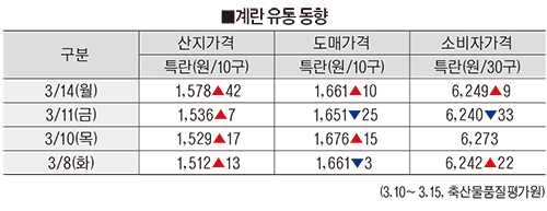 경상권에 이어 지난주 수도권과 호남지방에서도 계란 산지시세가 상승(전품목, 구당 8원)하며 전주(1천550원, 대한양계협회 특란 10구)보다 소폭 상승한 1천620원(11일 기준)을 기록했다. 대한양계협회(회장 이홍재)는 이같은 원인을 현장에서 질병의 의해 생산성이 하락된 상황에서, 그간 고병원성 AI 발생과 사료값 인상 등의 원인으로 일부 농가들이 입식에 차질을 빚었기 때문인 것으로 분석했다.