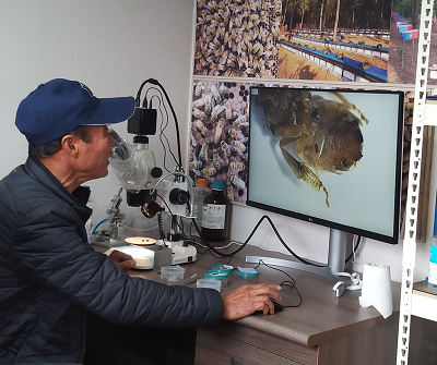 4년 전부터 평소와는 달리 꿀벌이 잘되지 않는다고 느낀 이 씨는 “현미경으로 시험을 하던 중 올 7월부터 이상한 응애류를 발견했다. 발견된 응애류는 기존 약제에도 쉽게 죽지 않고 크기가 너무 작아 눈으로 보이지 않아 죽었는지 살았는지를 확인할 수 없고 현미경으로만 관찰할 수 있었다”며“또한 응애류는 꿀벌 몸에서 잘 떨어지지 않고 더듬이를 비롯해 어미와 새끼가 꿀벌 한 몸에서 기생하는데 10월부터는 색깔이 있는 응애가 나오기 시작해 월동을 준비하는 것 같다”고 추측했다.