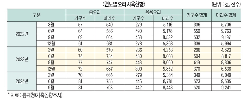 통계청 가축동향조사에 따르면 2024년 9월 1일 현재 오리 2천수 이상을 사육중인 농가는 520호, 총 사육마리수는 9,241천수로 전년 동기 880만6천수 대비 4.9%증가하였다. 지역별 오리농가는 전라남도가 257호(49.4%)로 가장 많고 다음이 전북 119호(22.9%)로 전남북이 전체 오리농가의 72.3%(376호)를 차지한다. 전국 오리농가들의 평균 사육마리수는 1만7천771수이다.