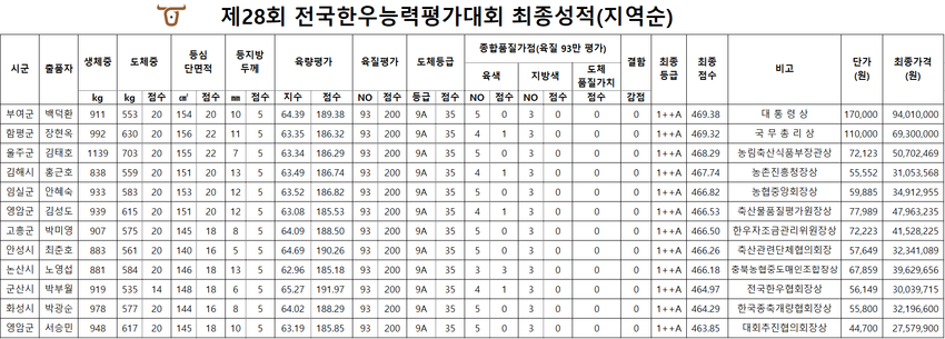 영예의 대통령상은 충청남도 부여군 대양농장 백덕환 대표가 차지했는데, 해당 출품우는 도체중 553㎏, 등심단면적 154㎠, 1++A로 최고 성적을 기록했으며, ㎏당 17만원, 총 낙찰가 9천401만원으로 역대 대회 최고가를 경신했다.