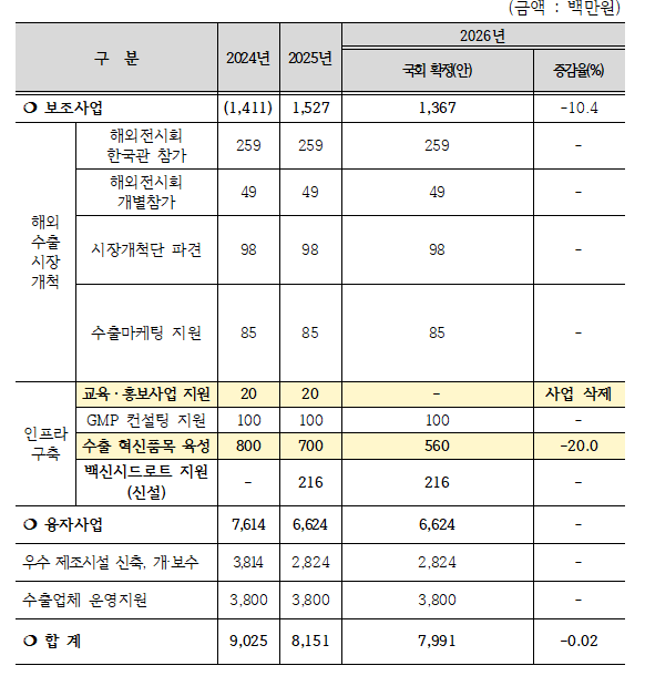 보조사업 중 인프라 구축 예산은 GMP 컨설팅 지원 1억원, 수출혁신품목 육성 5억6천만원, 백신시드로트 지원 2억1천600만원 등으로 편성됐다. 전년 2천만원 투입됐던 교육·홍보 지원 예산은 2026년에는 빠졌다.
