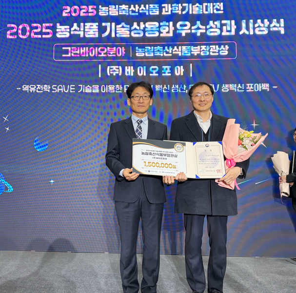 바이오포아(대표 조선희)는 지난 11일 서울 양재동 aT센터에서 열린 ‘2025년 농식품 R&D 기술상용화’ 시상식에서 그린바이오 분야 최우수상(농림축산식품부 장관상)을 수상했다.