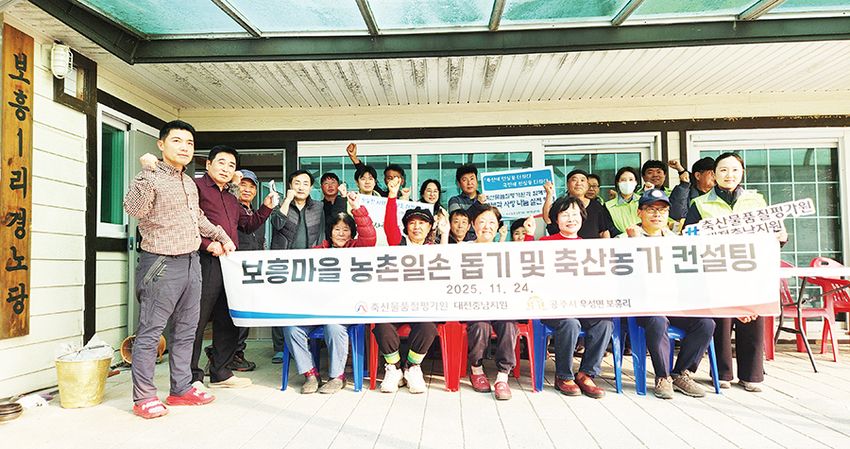 축산물품질평가원 대전충남지원(지원장 선창완)은 지난 11월 24일 공주시 우성면 보흥마을에서 지역사회와 상생하는 농촌 봉사활동과 축산농가 맞춤형 서비스 제공을 위한 ‘일손 돕기 및 축산농가 컨설팅’<사진>을 실시했다.