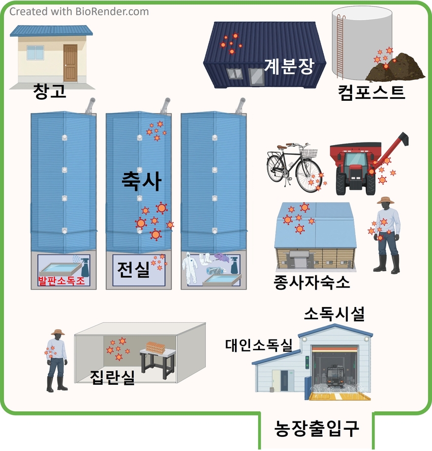 사람이 접근하고 접촉하는 축사내외부의 모든 공간과 표면에 대한 주기적인 세척과 소독이 얼마나 중요한 지를 역으로 생각해 볼 수 있는 자료라고 할 수 있겠다.