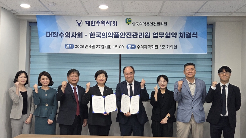 대한수의사회(회장 우연철)는 지난 4월 27일 수의과학회관에서 한국의약품안전관리원(원장 손수정)과 업무협약을 맺고, 동물병원 마약류 의약품 안전관리 강화와 수의·보건 분야 협력 확대에 힘을 모으기로 했다.