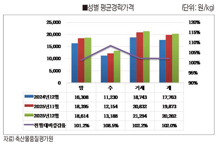 2025년 12월 한우 시세는 소비자 물가 상승과 경기침체로 인한 소비위축에도 불구하고, 군 급식, 학교 급식, 각종 연말연시 행사 모임, 유통업체 설 선물세트 준비 등으로 인한 수요 증가의 영향으로 인하여 전월대비 약강세를 보였다. 성별로 전월대비 경락가격 증감률을 보면 암소 101.2%, 수소 108.5%, 거세 102.2%로 전월대비 암소 1.2%, 수소 8.5%, 거세 2.2% 증가했다.
