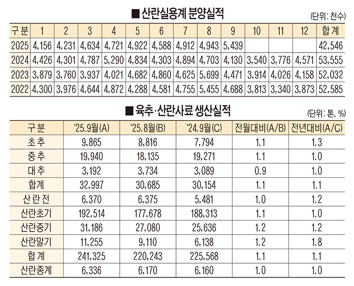 9월 산란종계 7만7천960수로 전월대비(3만9천500수) 97.4% 증가, 전년대비(5만3천수) 47.1%증가했다. 산란계 병아리 판매수는 543만9천수로 전월대비(494만3수) 10.0% 증가, 전년대비(413만수) 31.7% 증가했다.