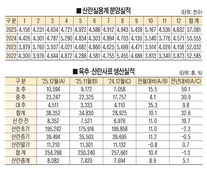 육추 사료 생산실적은 3만8천352톤으로 전월대비(3만4천830톤) 10.1% 증가, 전년대비(2만8천925톤) 32.6% 증가하였고, 산란계 사료는 25만4천298톤으로 전월대비(23만241톤) 10.4% 증가, 전년대비(25만7천660톤) 1.3% 감소하였다. 산란성계 도축실적은 335만2천수로 전월대비(376만3천수) 10.9% 감소, 전년대비(267만9천수) 25.1% 증가하였다. 전국 계란(특란/10개) 평균가격은 1천770원으로 전월대비(1천820원) 2.8% 하락, 전년대비(1천674원) 5.7% 상승하였다. 2025년도 4분기 가축동향조사결과 산란계 사육마릿수는 8천269만2천수로 전년동기대비 368만9천수(4.7%), 전분기대비 160만9천수(2.0%) 증가하였다.