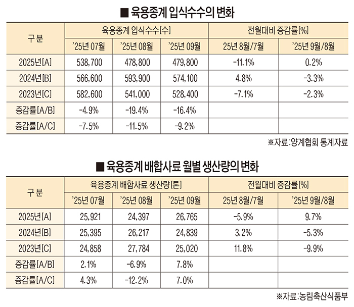 9월 육용종계 배합사료는 2만6천톤으로 전년동월대비 7.8% 증가한 물량이 공급됐다.(전년동월 2만4천톤) 종계사료 증가는 AI 및 2026년 전반기 종란생산확대를 위해 종계 생산연장이 진행되면서 증가한 것으로 보인다. 생산연장의 경우 10월 현재 20만수~30만수로 파악되지만 12월 최대 50만수 이상이 될 것으로 예상된다.